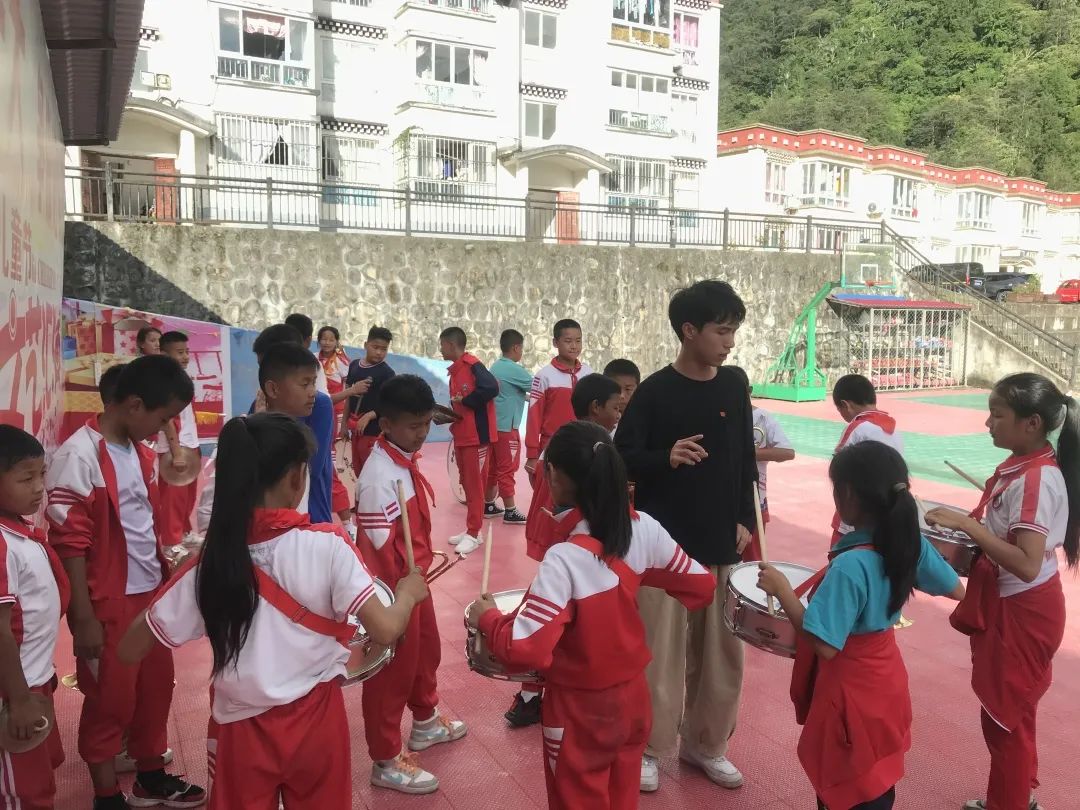 经过好几旬努力的排练,也在儿童节文艺汇演中展现出完满的成果。支教中身兼多职,其中主要的是音乐老师,因为全校只有我一位音乐老师。所以我也自然的负责了各种演出,以及组建的鼓号队。